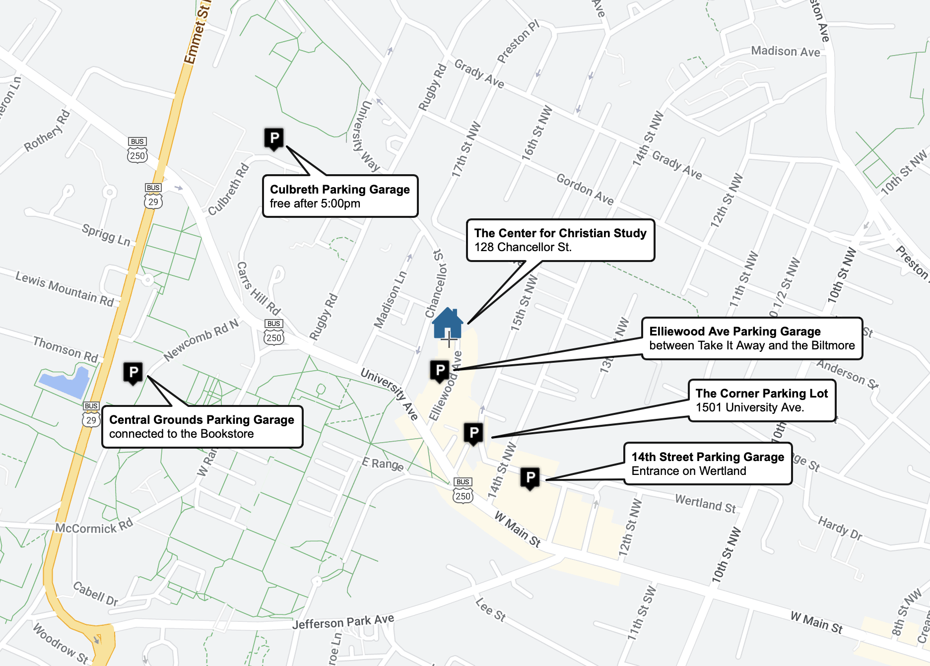 Culbreth Parking Garage (free after 5:00 p.m. on weekdays and free on weekends) - 130 Culbreth Road